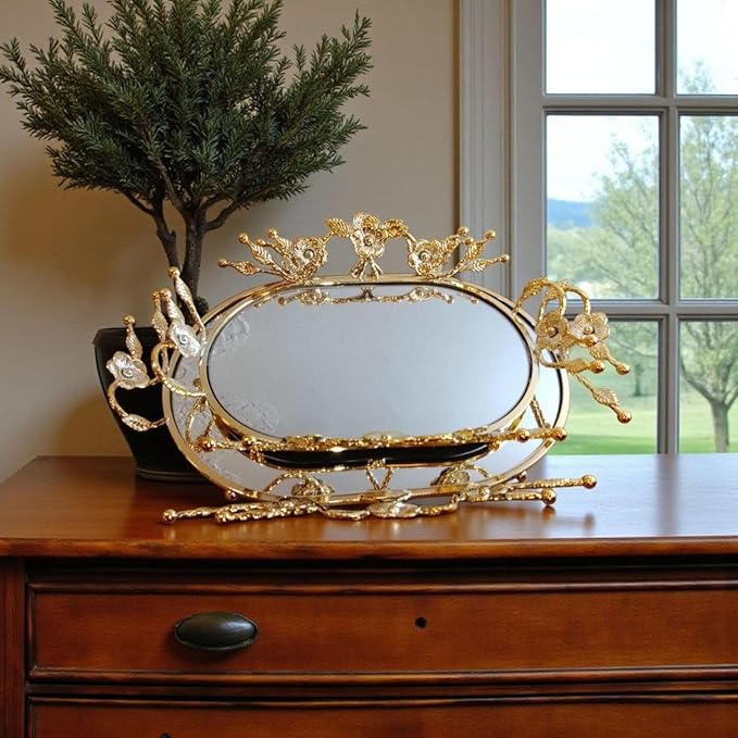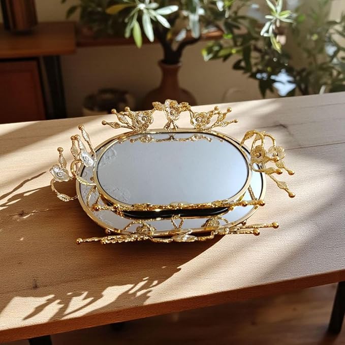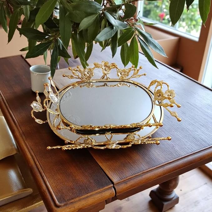 طقم صواني فاخرة من قطعتين بإطار معدني ذهبي مزخرف وزجاج معكوس ديكوري