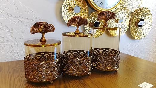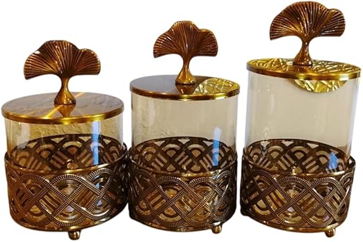 طقم بونبونيرة زجاجية فاخرة بغطاء ذهبي وزخارف جينكو مع قاعدة معدنية ديكورية