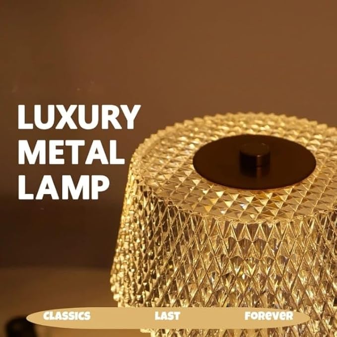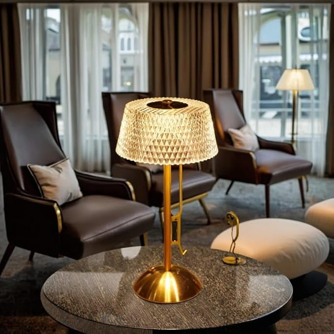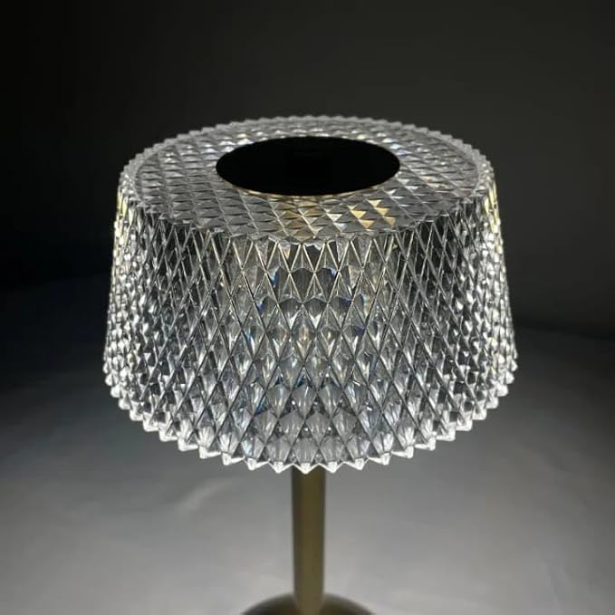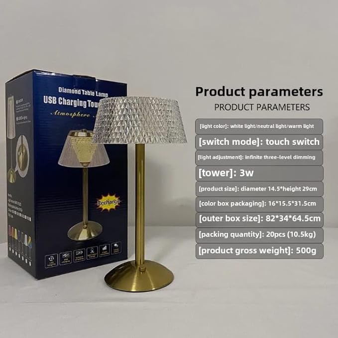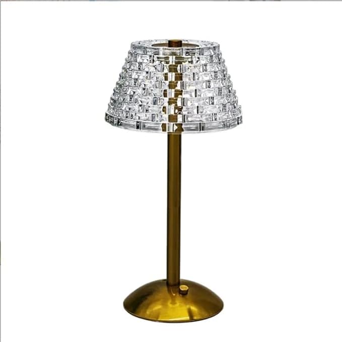 مصباح طاولة أنيق باللون الذهبي بتصميم عصري فاخر، يمنح إضاءة كريستالية ناعمة تضيف لمسة من الفخامة لغرفة النوم أو المكتب. يعمل باللمس مع 3 مستويات للإضاءة حسب الحاجة، ويتميز ببطارية قابلة للشحن عبر USB لسهولة الاستخدام في أي مكان.