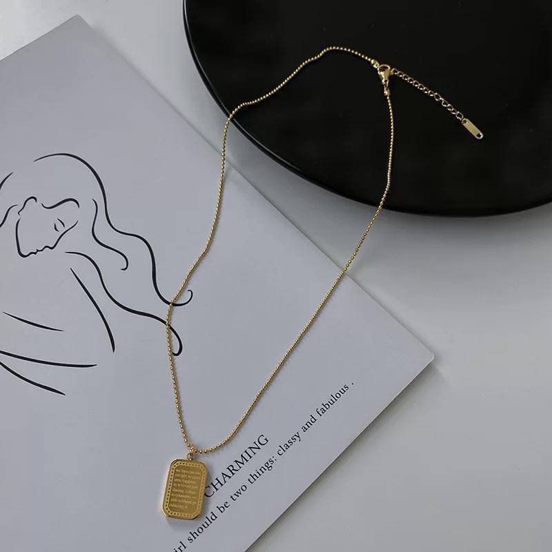 عقد أنيق يجمع بين البساطة والفخامة بتصميم مستطيل باللون الأسود مع كتابة محفورة على الظهر تضيف لمسة شخصية مميزة. مصنوع من الستانلس ستيل اللامع المقاوم للصدأ لضمان المتانة واللمعان الدائم. يجسد هذا العقد أسلوبًا عصريًا راقيًا يناسب الإطلالات اليومية والمناسبات الخاصة، ويُعد اختيارًا مثاليًا لهدية أنيقة ذات طابع خاص.