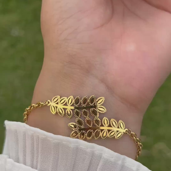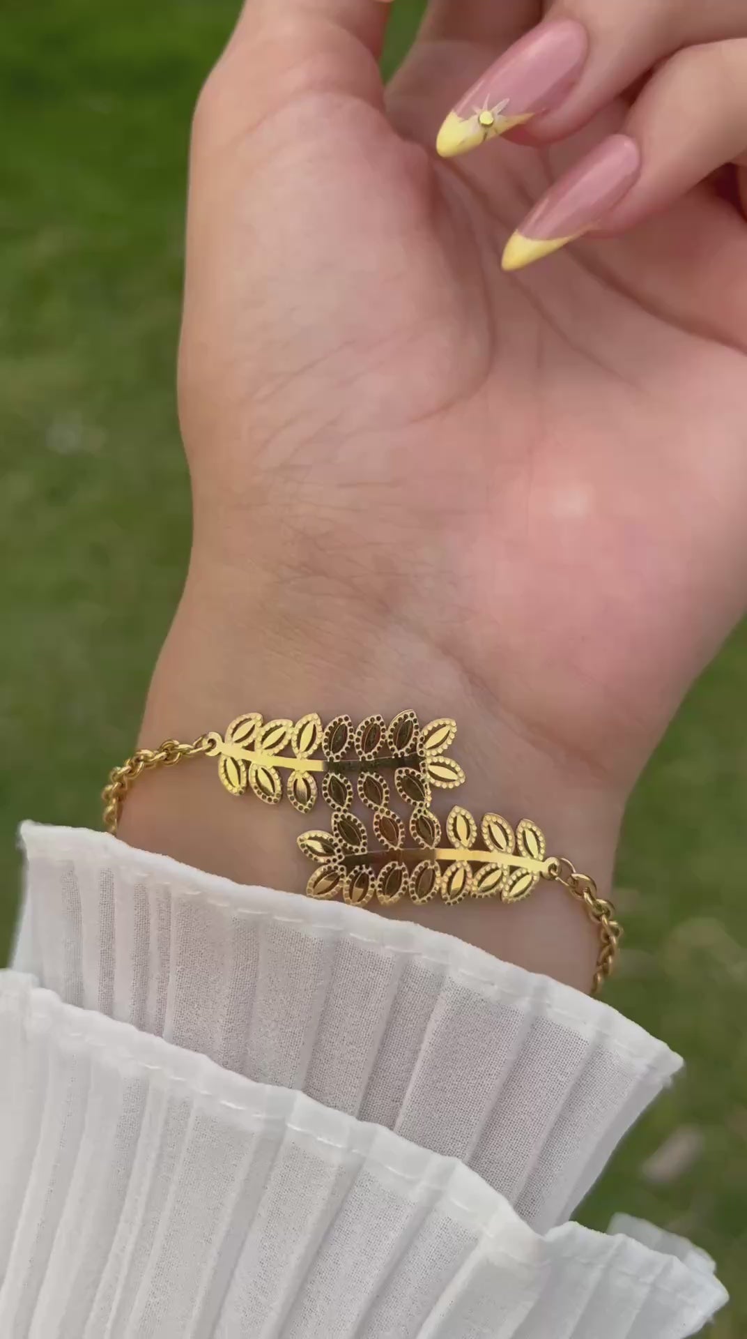 إسوارة راقية بتصميم غصن الزيتون الذي يرمز إلى السلام والجمال الطبيعي. مصنوعة من ستانلس ستيل بيور مطلي بالذهب اللامع لتمنحك مظهرًا أنيقًا وفخمًا يدوم طويلاً. تصميمها العصري يجعلها قطعة مثالية للإطلالات اليومية والمناسبات الخاصة، ويمكن ارتداؤها بمفردها أو مع إكسسوارات أخرى لمظهر أكثر تميزًا.