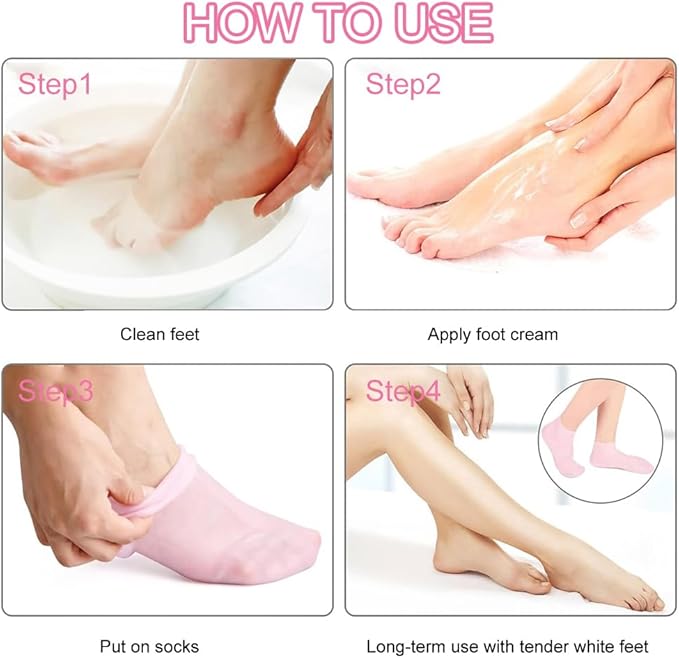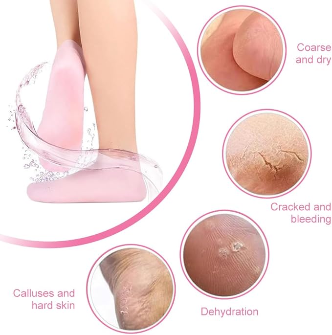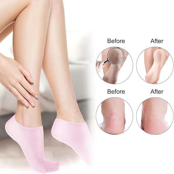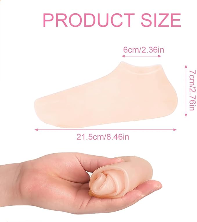 جوارب سيليكون مرطبة من ، مصممة خصيصًا للنساء للعناية بالقدم وتنعيم البشرة الخشنة. مرنة ومضادة للانزلاق، مثالية للاستخدام في جلسات الباديكير المنزلية أو اليومية مع الكريمات والزيوت المرطبة للحصول على قدم ناعمة وصحية.