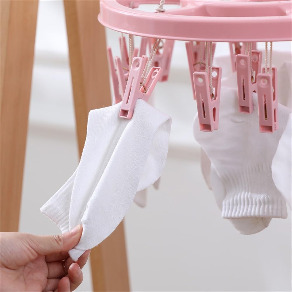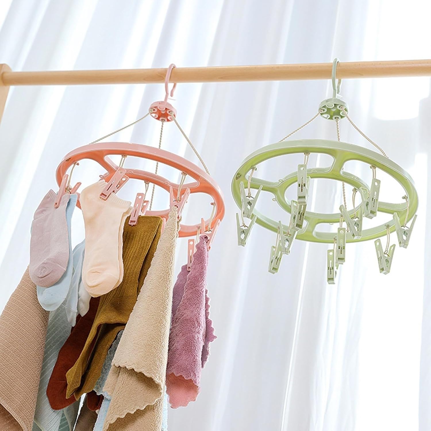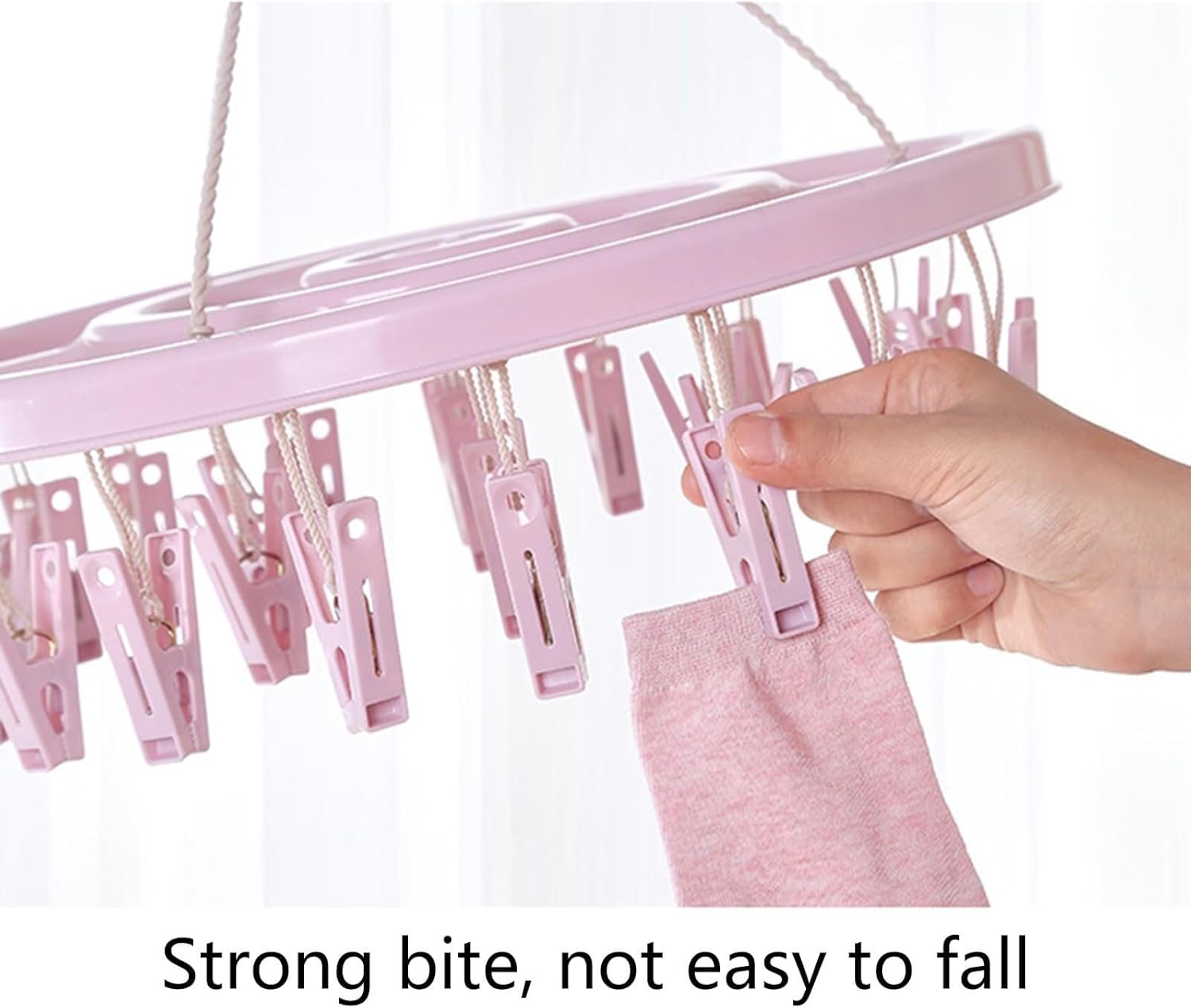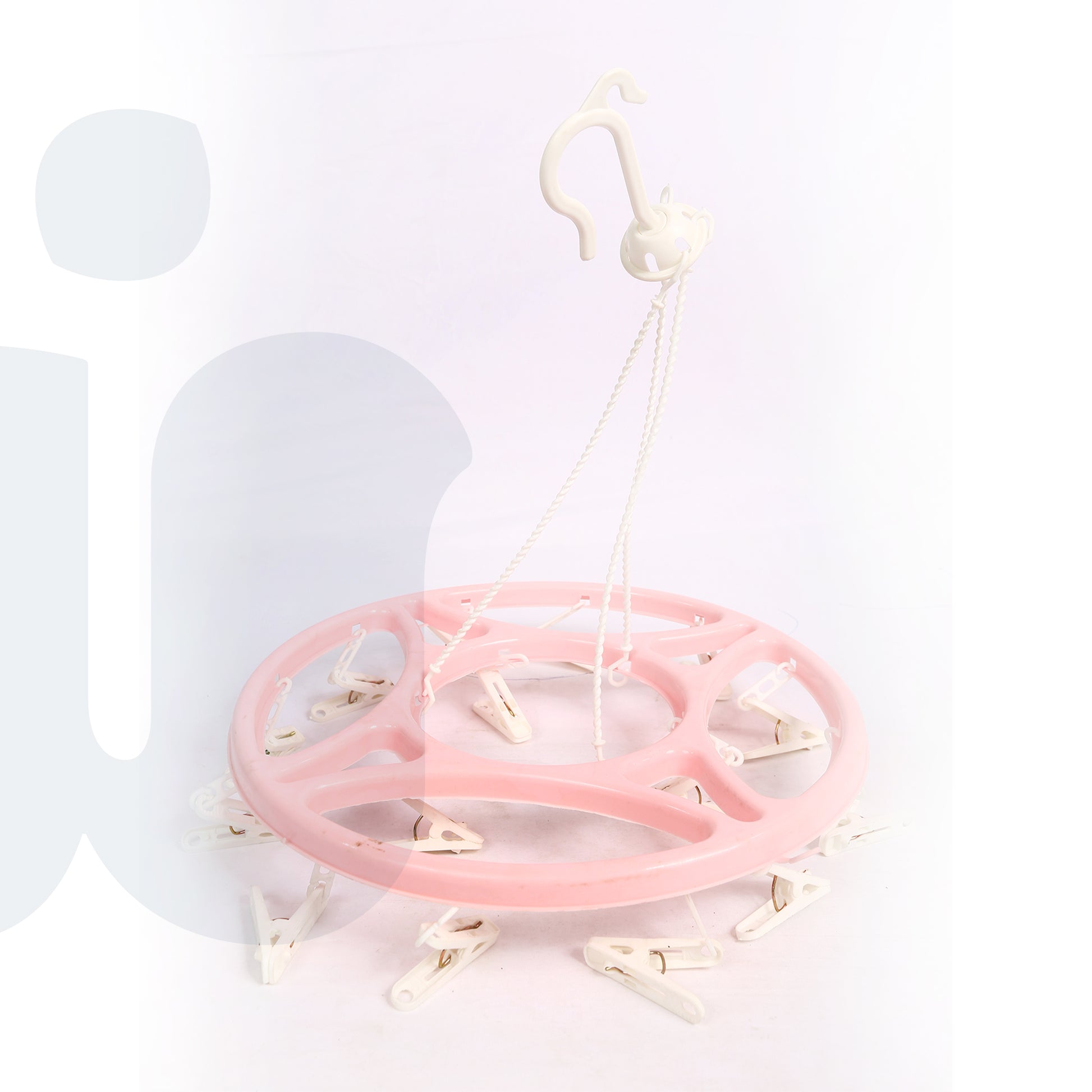 منشر غسيل عملي بتصميم دائري مصنوع من البلاستيك المتين، مزود مشابك لتجفيف الجوارب، الملابس الداخلية، والمناشف الصغيرة بسهولة. يحتوي على شماعة متعددة الوظائف لتثبيته في أي مكان داخل المنزل أو على الشرفة. تصميمه القابل للطي يجعله سهل التخزين ويوفر المساحة عند عدم الاستخدام.