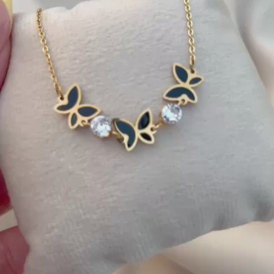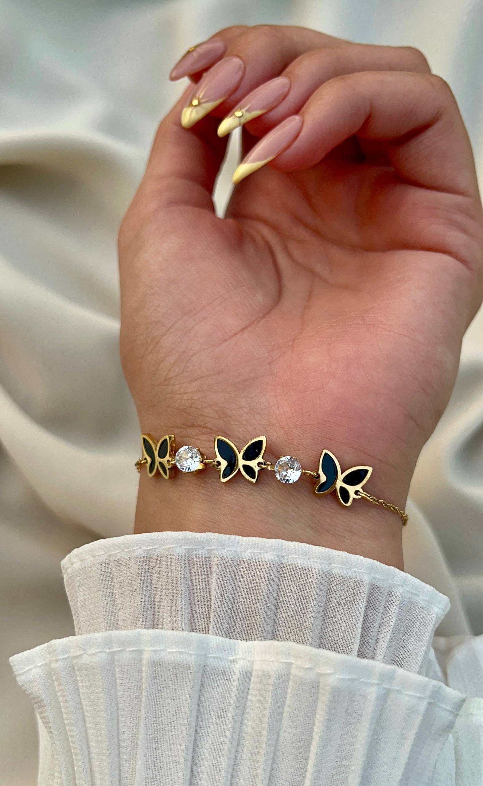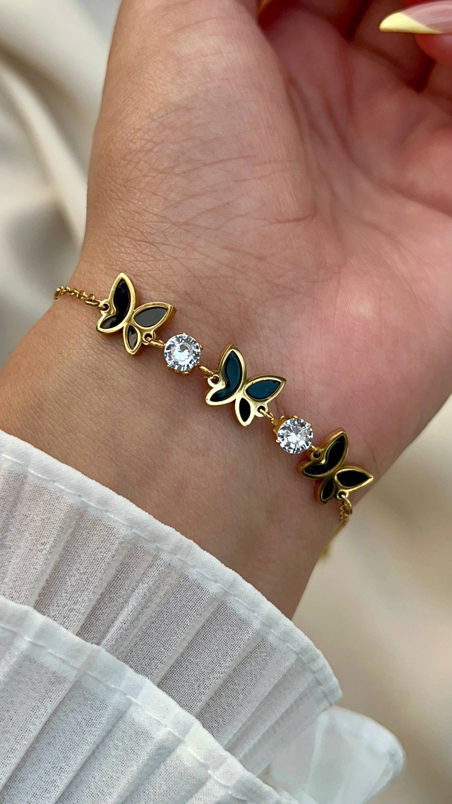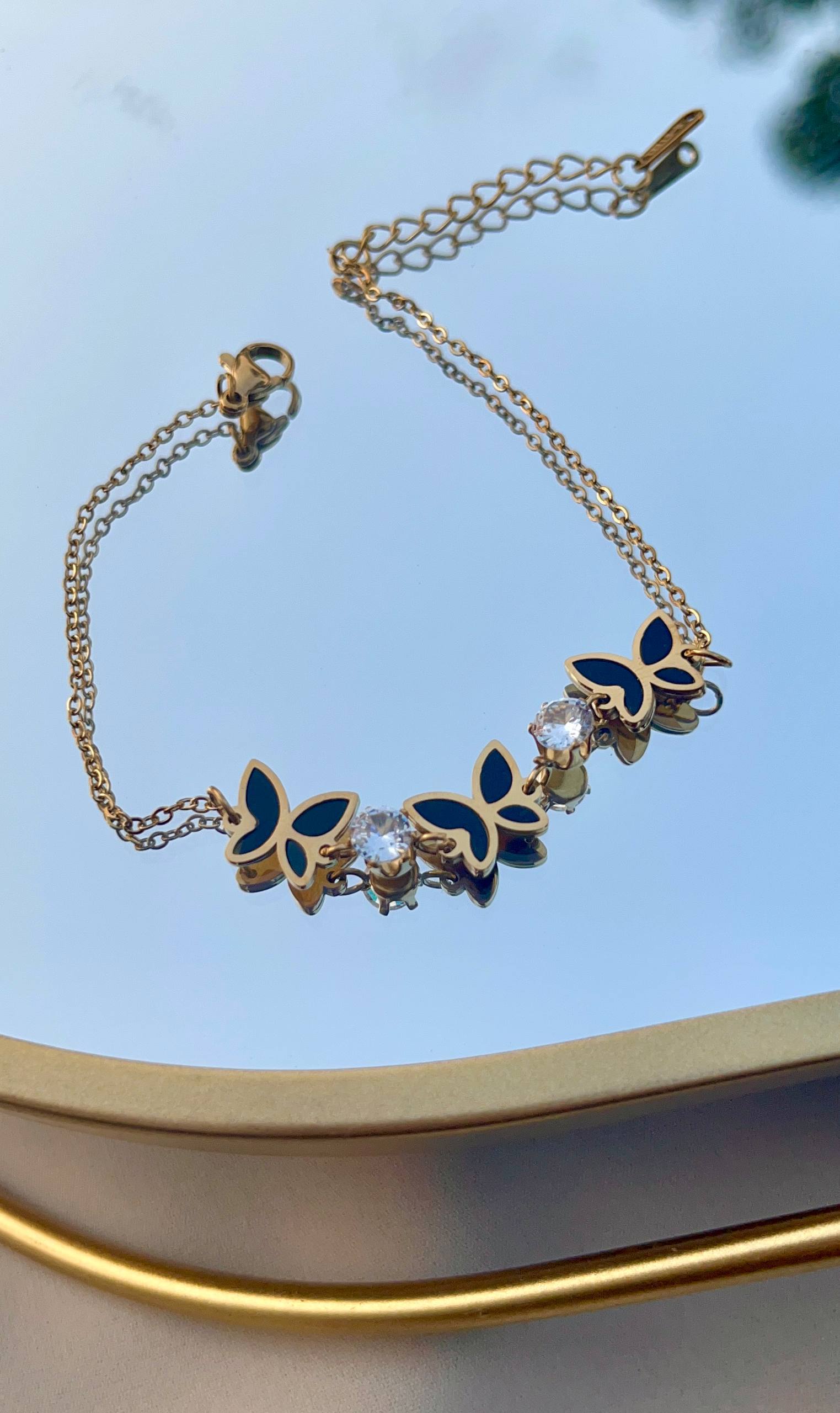 إسورة فراشة ستانلس بيور ذهبي مع تفاصيل سوداء وحبيبات كريستال لامعة
