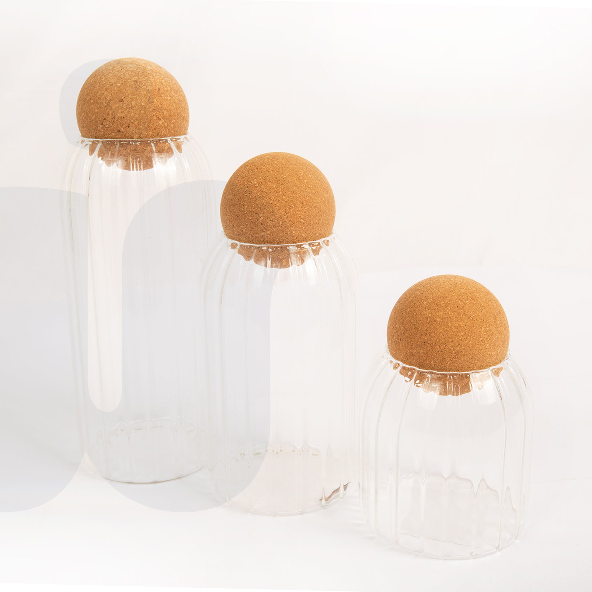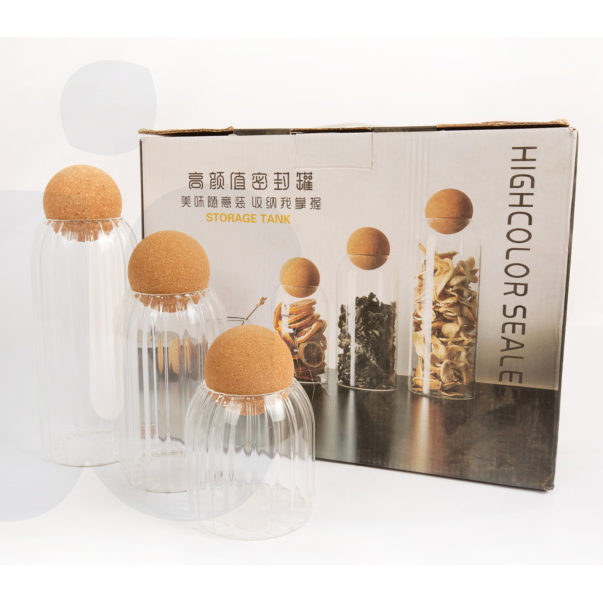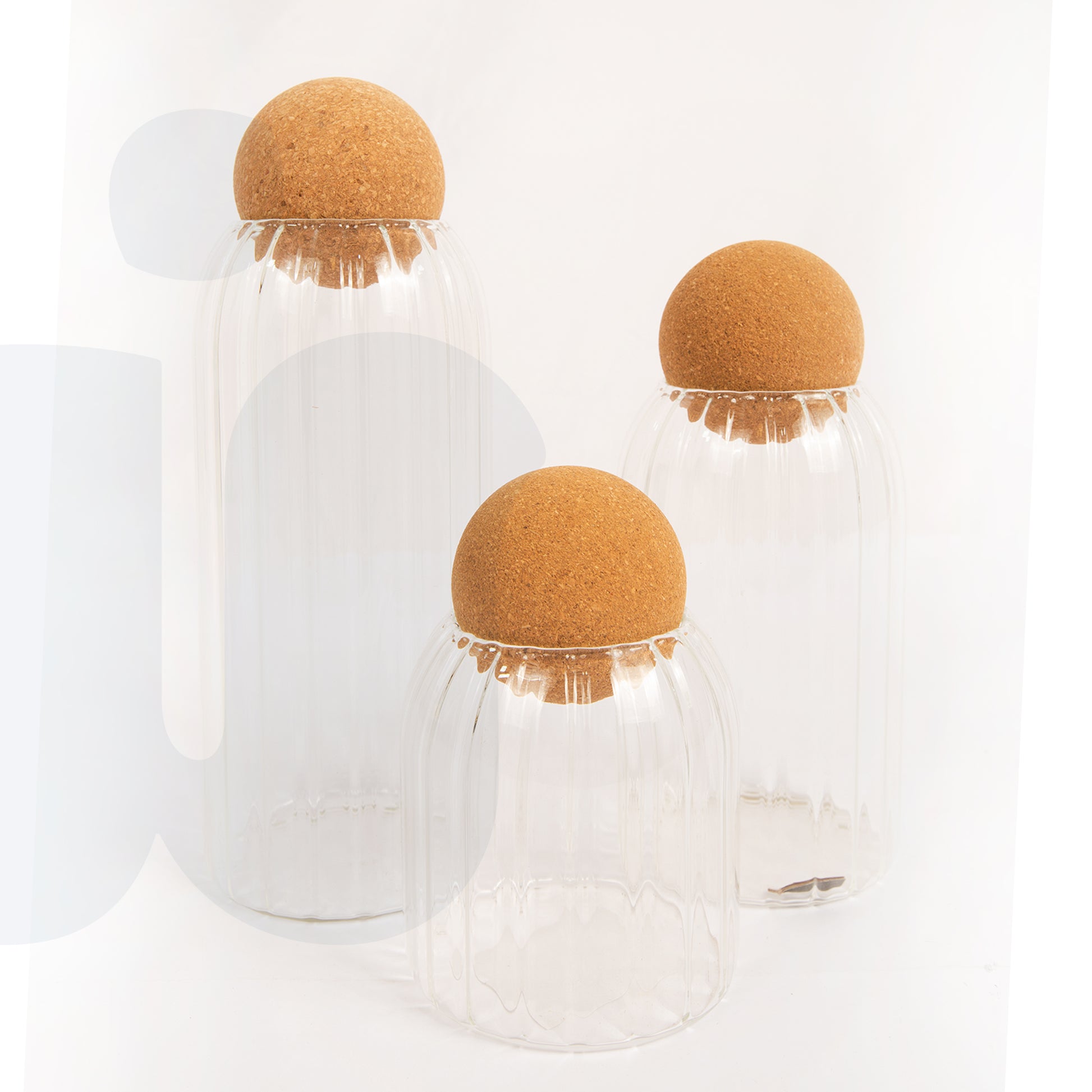 طقم برطمانات تخزين زجاجية مموجة بغطاء كروي من الفلين