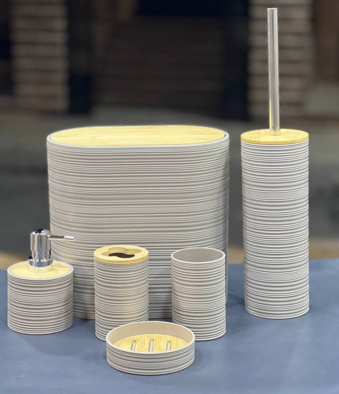 طقم حمام ملكي بتصميم مضلع أنيق وشكل بيضاوي عصري يضيف لمسة فخمة لديكور الحمام. مصنوع من خامات عالية الجودة ومستورد بكواليتي ممتاز يضمن المتانة وطول العمر. تصميم يجمع بين الجمال والعملية لتنسيق الحمام بأناقة راقية.