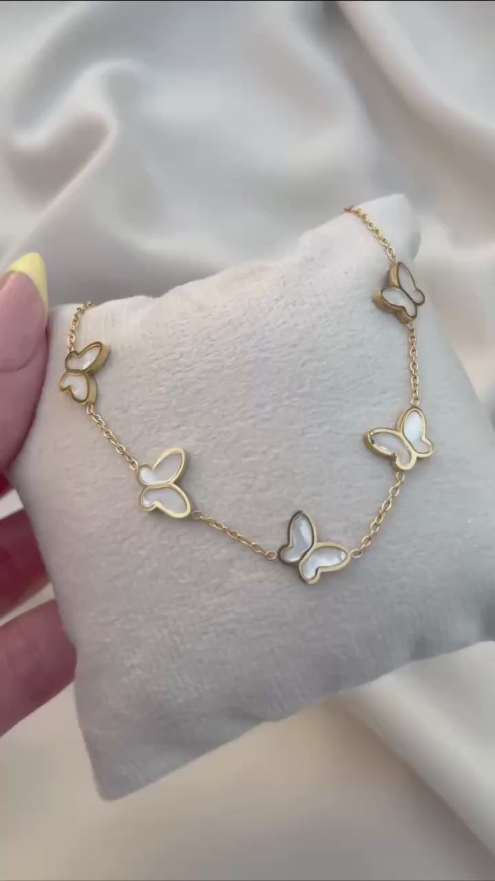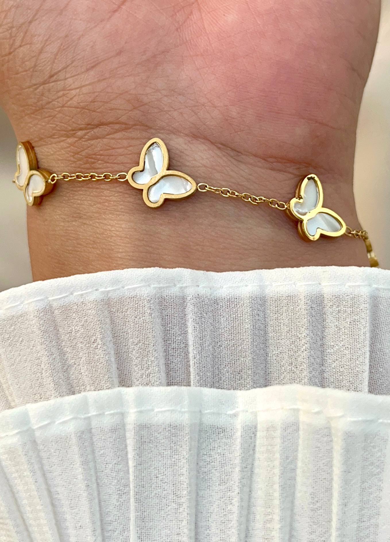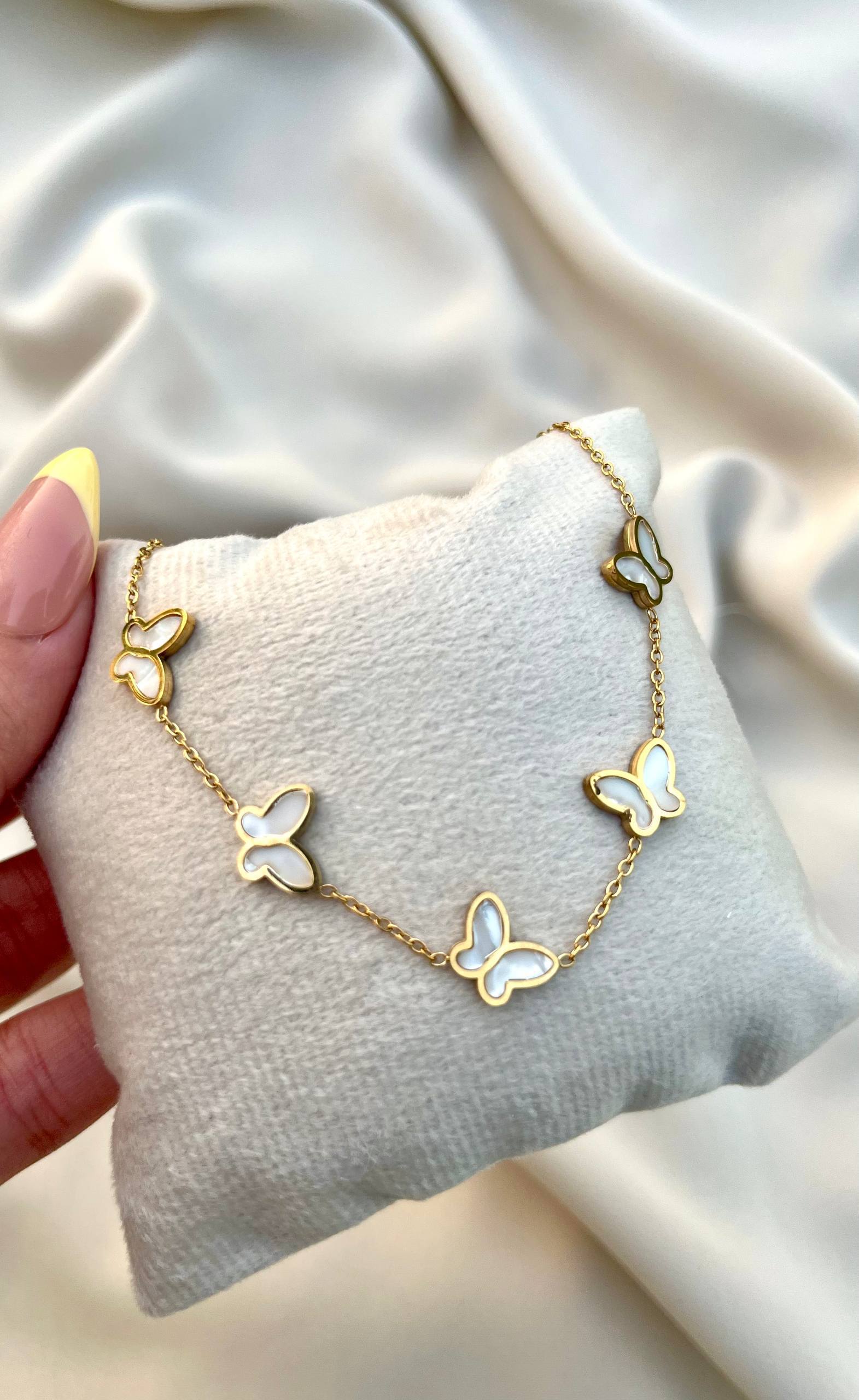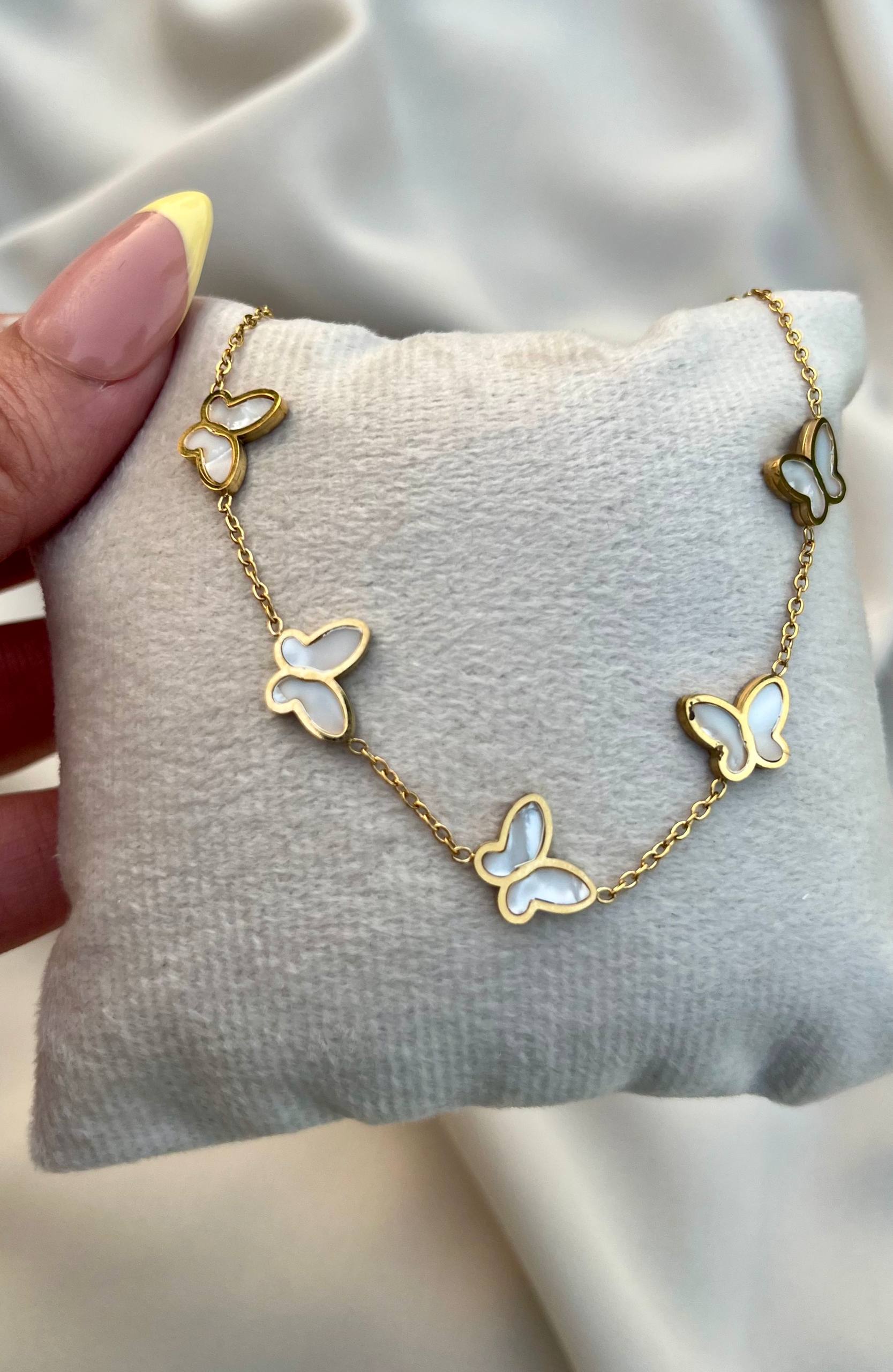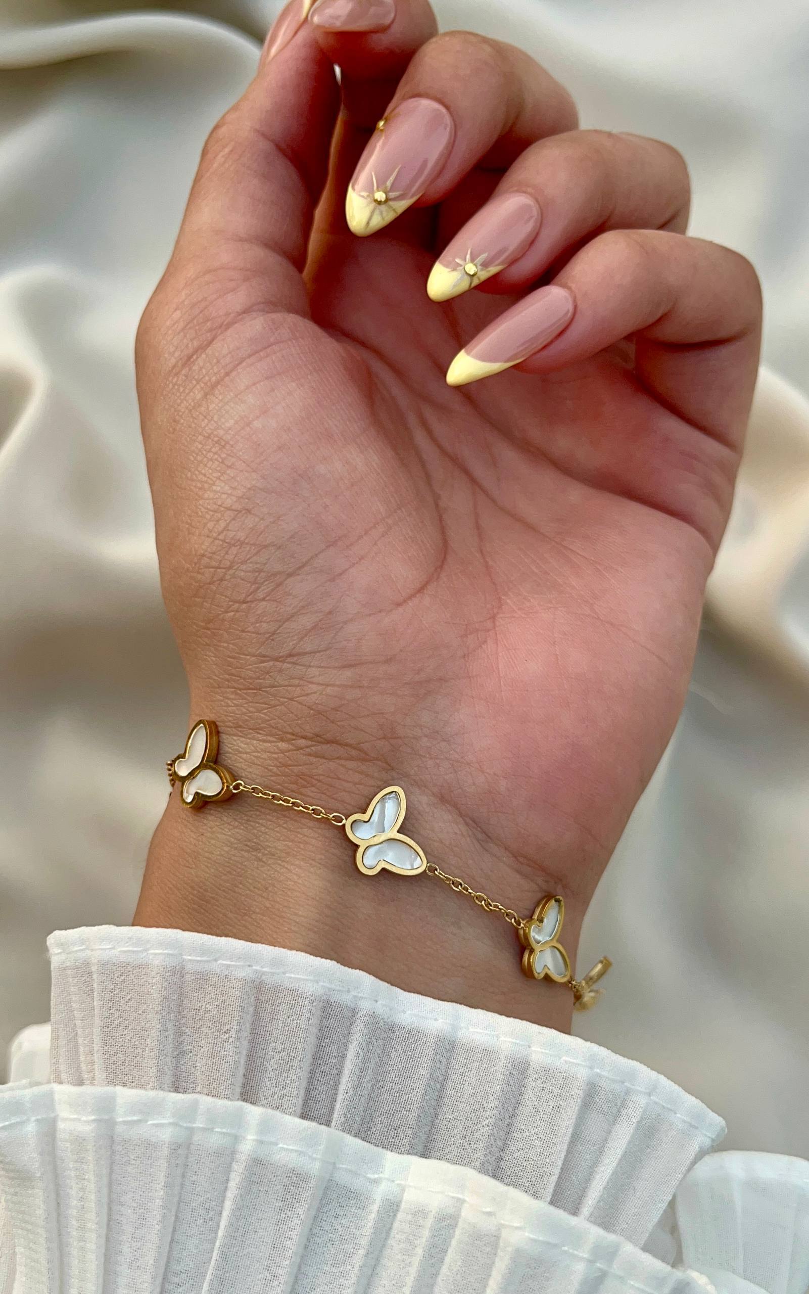 إسوارة أنيقة مصنوعة من ستانلس ستيل عالي الجودة بتصميم مزين بفراشات جميلة تمنح لمسة أنثوية راقية. تتميز ببريقها الجذاب ومتانتها العالية، مما يجعلها قطعة مثالية للإطلالة اليومية أو المناسبات الخاصة. تضيف لمسة من الجمال والنعومة إلى معصمك مع الحفاظ على المظهر العصري الفاخر.