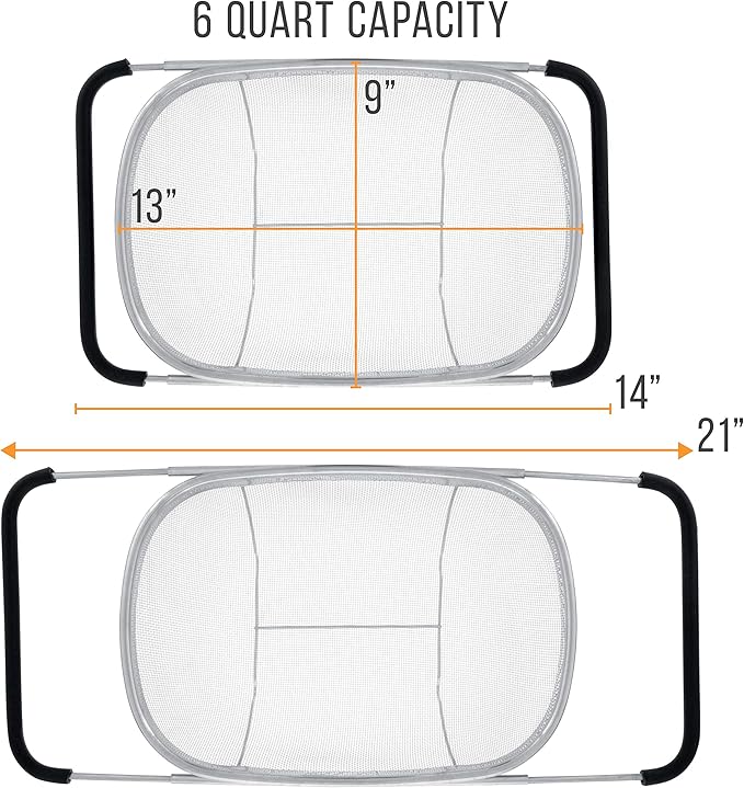 .شبكة دقيقة: تحتوي على شبكة دقيقة جدًا تمنع تساقط الأطعمة الصغيرة، مما يضمن تصفية كاملة وفعالة.مقبض قابل للتمدد: المقابض الجانبية قابلة للتمدد وتأتي بطبقة مطاطية، مما يوفر قبضة آمنة ويناسب جميع أحجام الأحواض.