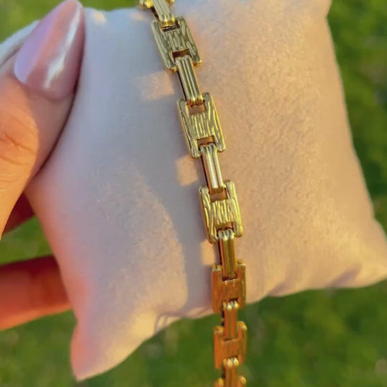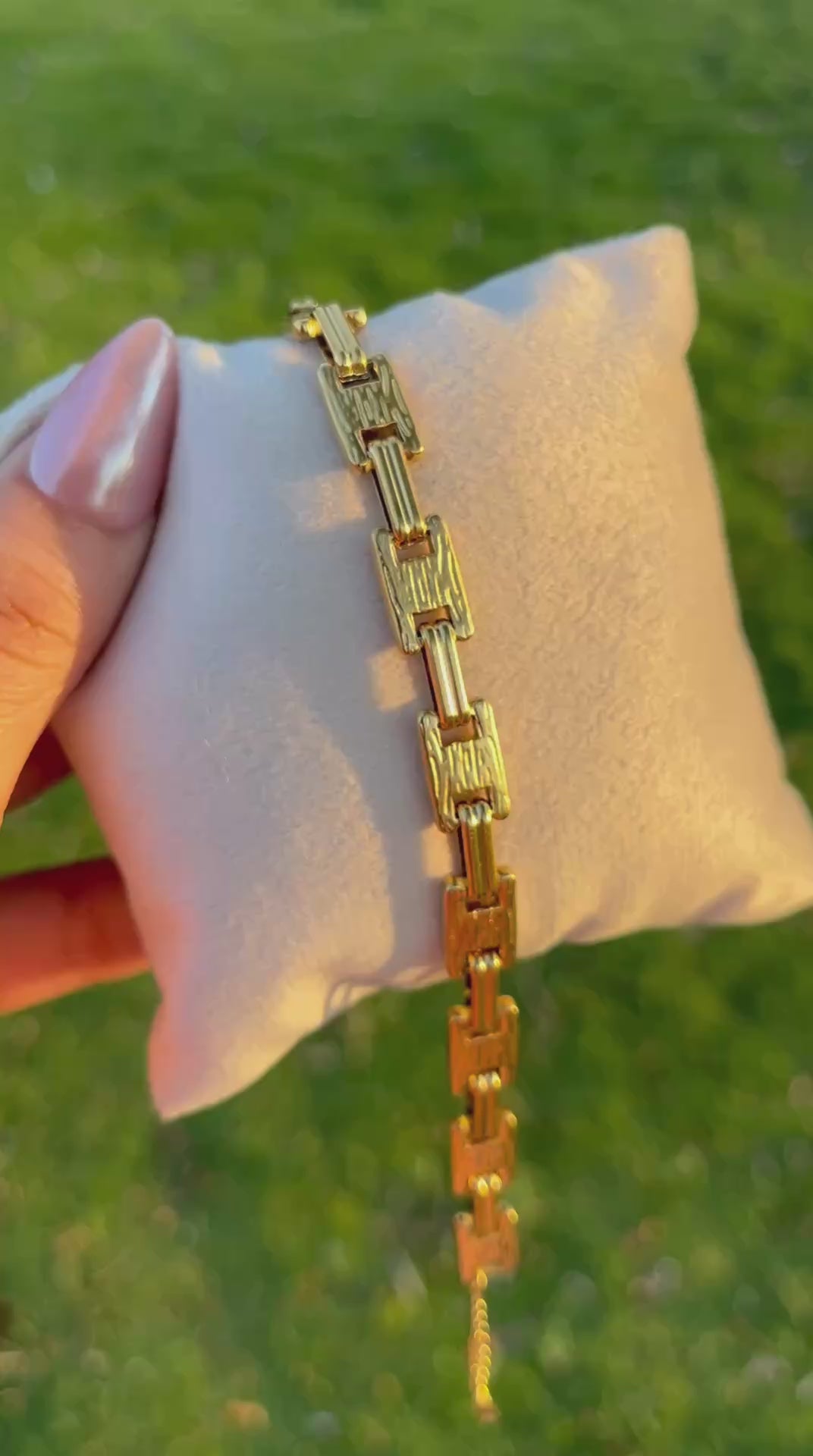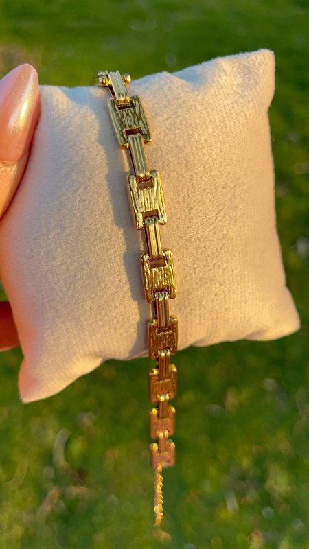 إسوارة أنيقة بتصميم فريد من روابط مستطيلة الشكل تضيف لمسة من الفخامة والعصرية إلى معصمك. مصنوعة من ستانلس ستيل نقي مقاوم للصدأ، تتميز بلمعان يدوم طويلاً ومتانة عالية تجعلها مثالية للاستخدام اليومي والمناسبات الخاصة. يمكن ارتداؤها بمفردها لإطلالة راقية أو مع إكسسوارات أخرى لتكملة أسلوبك الشخصي.