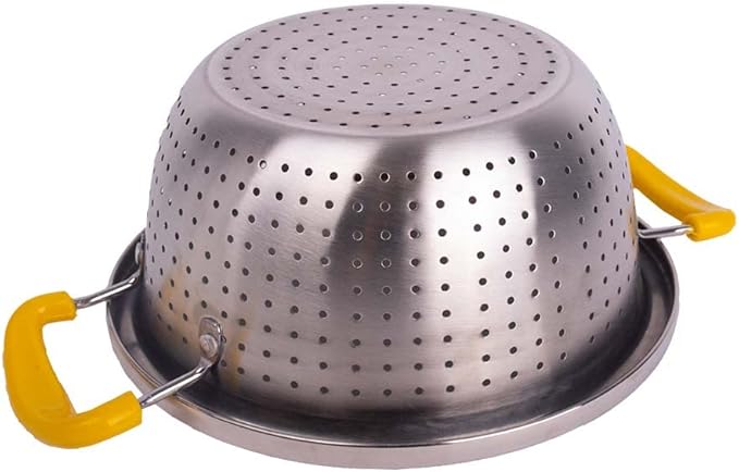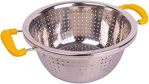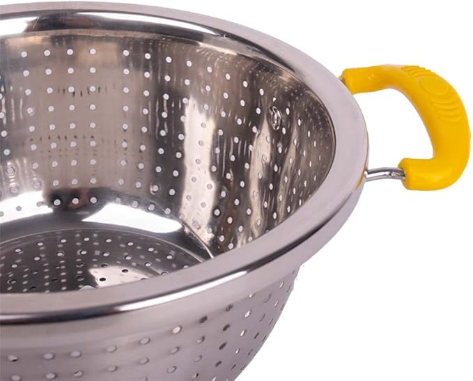 وعاء مصفاة دائري من الستانلس ستيل مع مقبضين بلاستيك – لتصفية الخضار والفواكه، مقاس 20 سم، باللون الفضي مع أصفر.