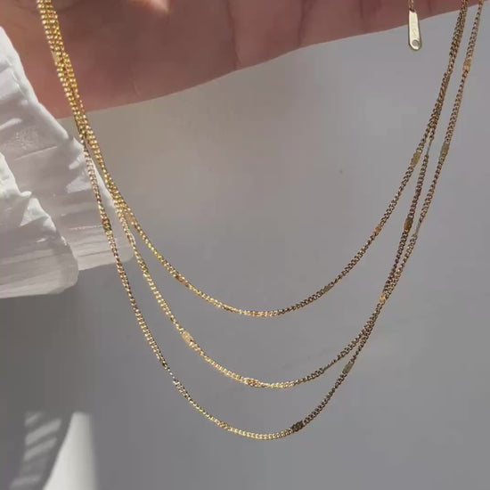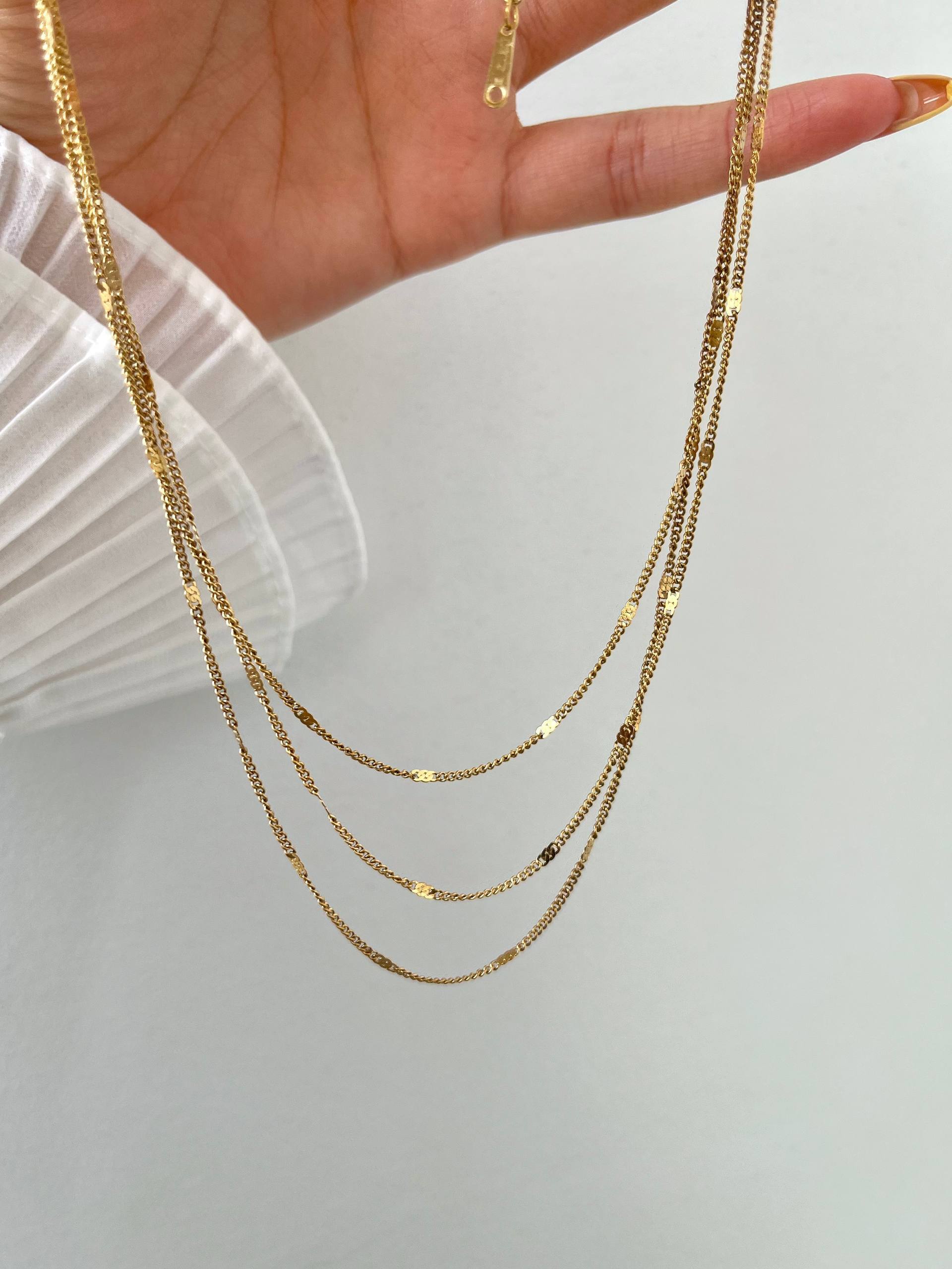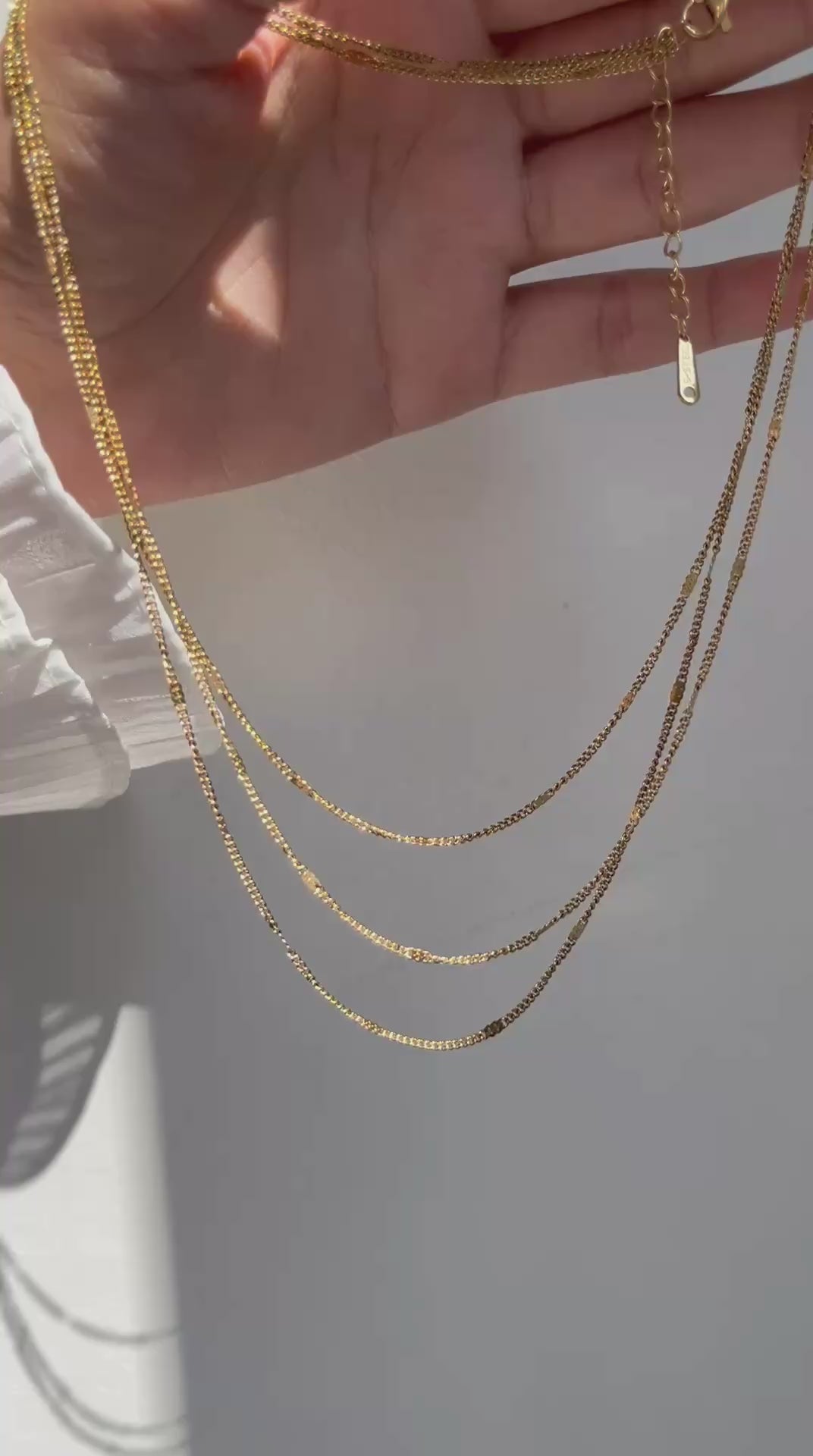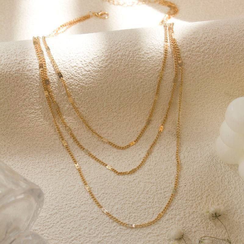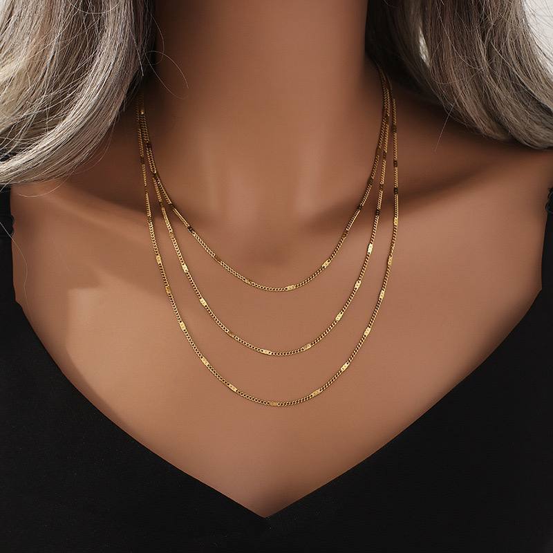 سلسلة أنيقة مكونة من ثلاث طبقات تضيف لمسة من الفخامة والعصرية إلى إطلالتك اليومية. تتميز بتصميم متدرج يجمع بين البساطة والأناقة، مصنوعة من الستانلس ستيل عالي الجودة المقاوم للصدأ للحفاظ على لمعانها لفترة طويلة. مناسبة للاستخدام اليومي أو للمناسبات الخاصة.