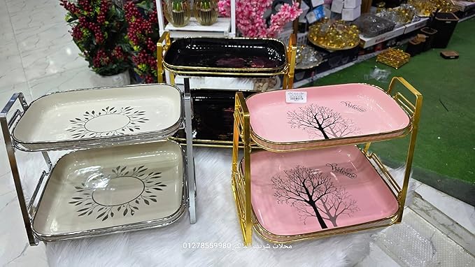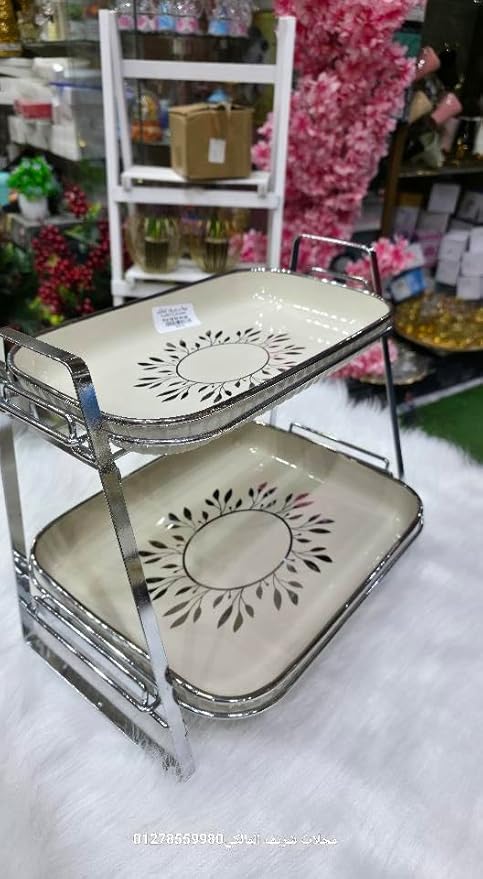 ارفع مستوى ضيافتك مع صينية التقديم الأنيقة هذه التي تجمع بين الجمال والعملية. مصممة بطبقتين لتوفير مساحة أكبر لتقديم الحلويات، الفواكه، أو المقبلات، وهي مثالية لجميع المناسبات، من حفلات الشاي إلى التجمعات العائلية.