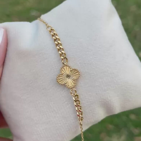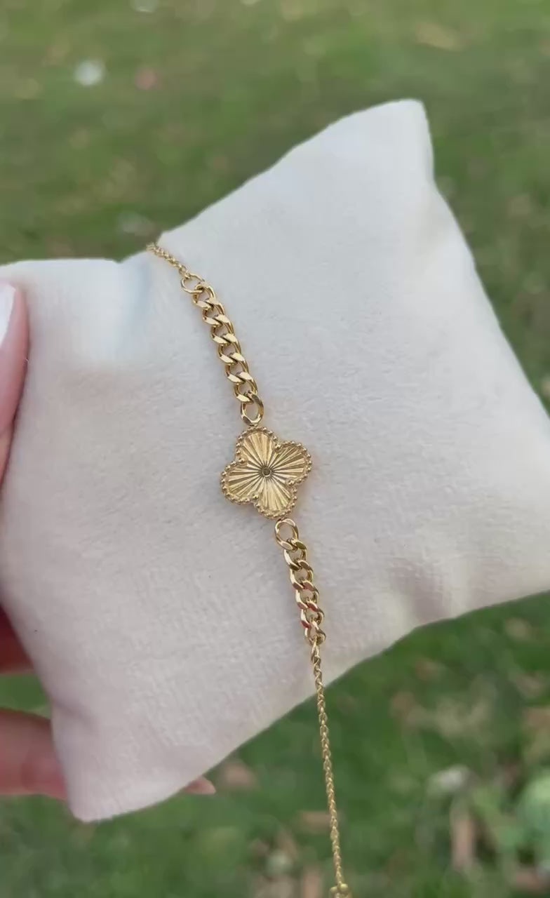 إسوارة فاخرة مستوحاة من تصميم فان كليف الكلاسيكي، مصنوعة من ستانلس ستيل عالي الجودة ومطلية بالذهب لتمنحك لمسة من الأناقة والفخامة. تتميز بتصميم أنثوي راقٍ يناسب جميع الإطلالات، سواء اليومية أو في المناسبات الخاصة. قطعة تضيف لمسة من الرفاهية والرقي لمعصمك وتُظهر ذوقك المميز في اختيار الإكسسوارات.