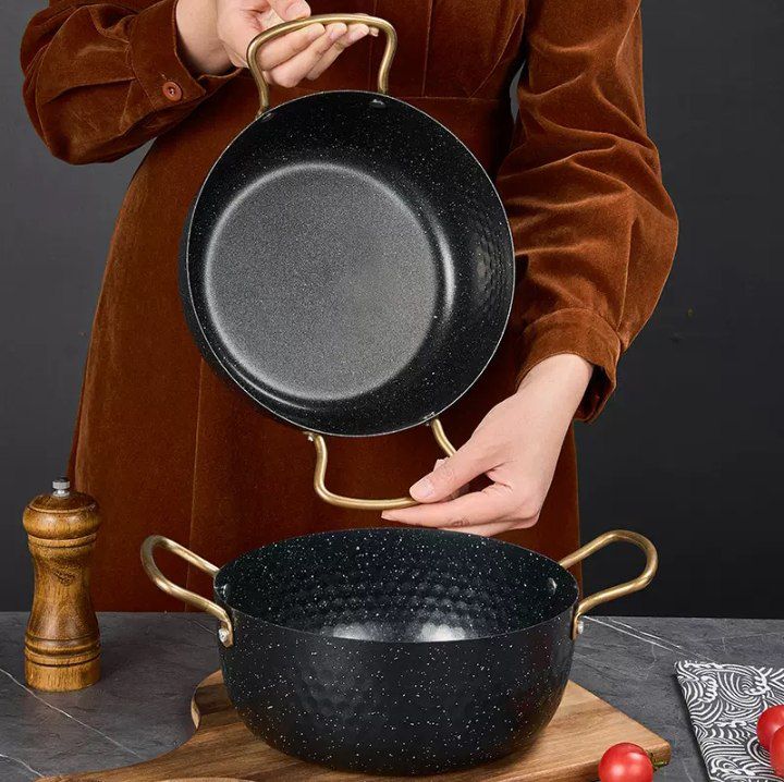 ووك أنيق مصنوع من استيل معدني مط عالي الجودة، يتميز بيد ذهبية فاخرة تمنحه مظهرًا جذابًا ومناسبًا للتقديم والاستخدام اليومي، كما يمكن استخدامه على النار مع وجود الشياطة فقط لضمان السلامة والحفاظ على جودته